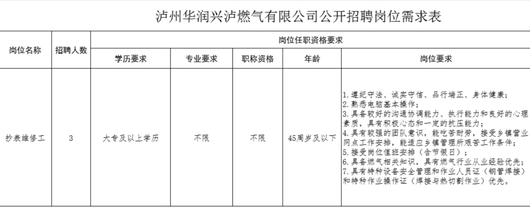 据了解,2025年5月底,泸州华润兴泸燃气有限公司面向社会公开招聘,招聘3名抄表维修工,学历要求是大专以上,岗位除了基本要求之外,还要求具备燃气相关知识,具有燃气行业从业经验优先,具备特种设备安全管理和作业人员证(钢管焊接)和特种作业操作证(焊接与热切割作业)优先。
